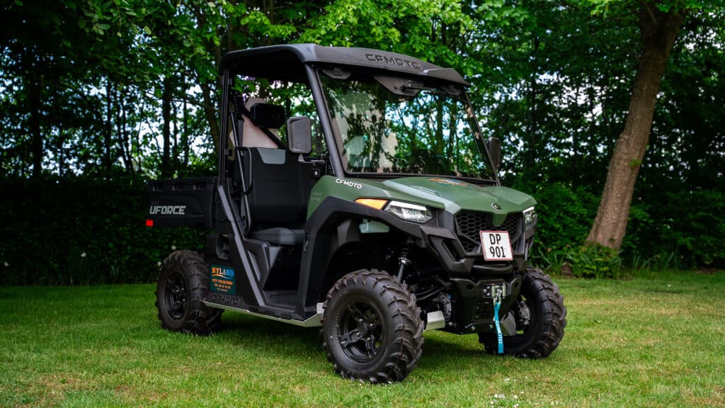 CFMOTO UForce 600 er en stærk og alsidig UTV med benzinmotor. Med en venderadius på 4,5 meter og en frihøjde på 270 mm er den let at manøvrere – selv i udfordrende terræn som skove, enge og marker. Den har plads til to personer og er udstyret med trækspil foran, hvilket gør den særligt velegnet til opgaver.