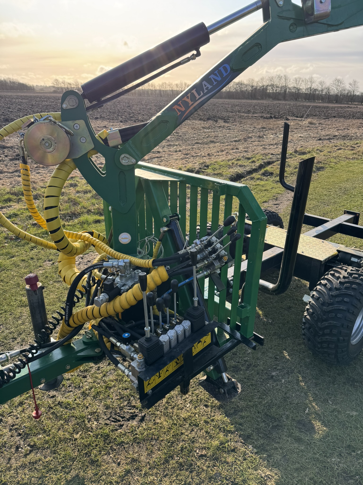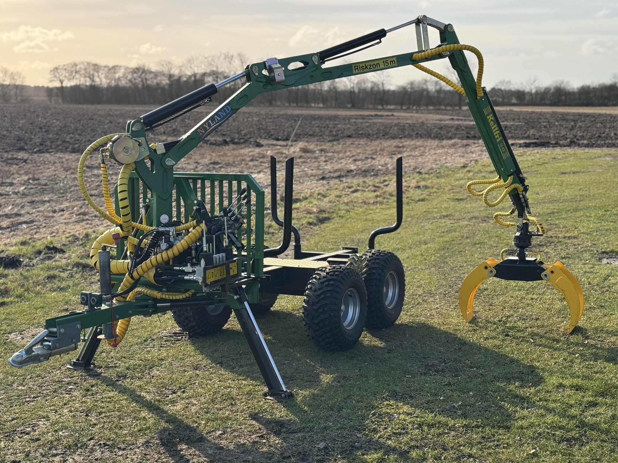 Robust og fleksibel skovvogn med hydraulisk kran, velegnet til entreprenør-, anlægs- og skovopgaver samt transport på ujævnt og blødt terræn. Den integrerede hydrauliske kran gør det muligt at læsse træ på vognen. Den kan forskydes i længderetningen for at tilpasses forskellige stammelængder